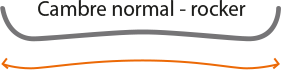 • Cambre plat rocker (flat rocker) Tout comme le cambre plat, le plat rocker est un compromis entre le cambre classique et le cambre inversé. Ses spatules relevées qui lui conférent un excellent déjaugeage en poudreuse et offrent d’avantage de tolérance en park.