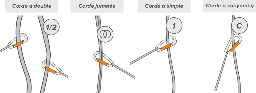 Ils ne peuvent (pour la plupart) accueillir qu’un seul bin de corde et sont donc réservé à l’assurage avec un corde à simple : assurage en salle et en falaise.