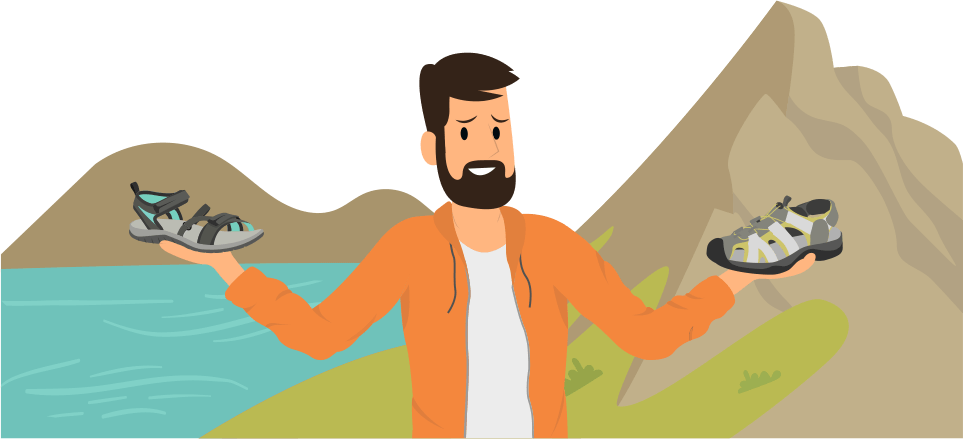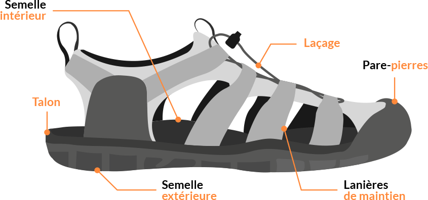 Tout aussi important que la semelle, le maintien de votre pied dans la sandale est un critère clé. Il est dû aux lanières, aux systèmes de serrage et aux points d’attache de vos sandales. Vous l’aurez compris, plus vous marcherez longtemps et/ou sur des terrains escarpés, plus vous aurez besoin d’un maintien fiable pour plus de sécurité. Nous avons vu précédemment la nuance entre sandales ouvertes et sandales fermées. Regardons plus en détails l’importance de la forme de vos sandales de marche.