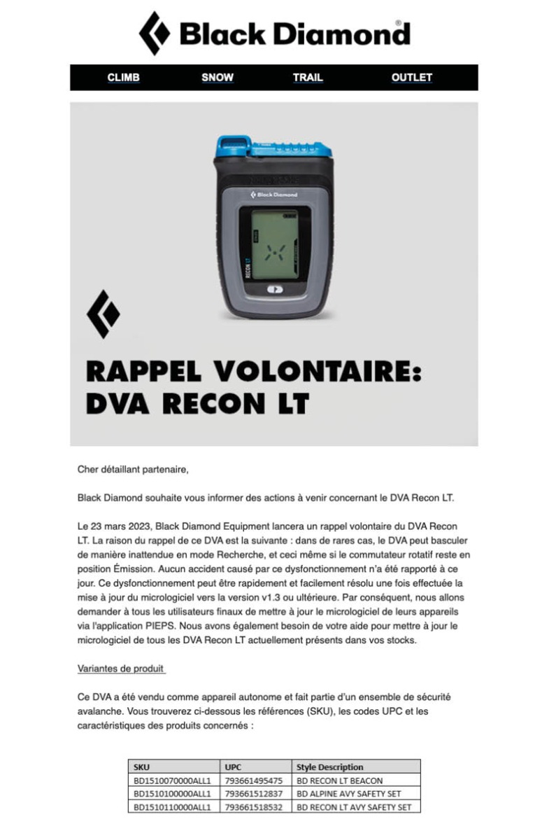 Rappel du DVA Recon LT (Black Diamond) pour une mise à jour du micrologiciel de l’appareil